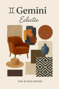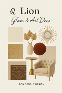 Αντικείμενα: Sunburst καθρέφτης, πολυθρόνα με χρυσές λεπτομέρειες, γεωμετρικό χαλί