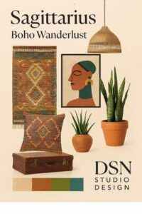 Αντικείμενα: Ξύλινο ράφι, κεραμικό μπολ, pop art βάζο, αφηρημένο poster