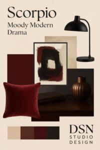 Αντικείμενα: Μαύρη λάμπα, κόκκινο μαξιλάρι, abstract πίνακας, vintage αντικείμενα