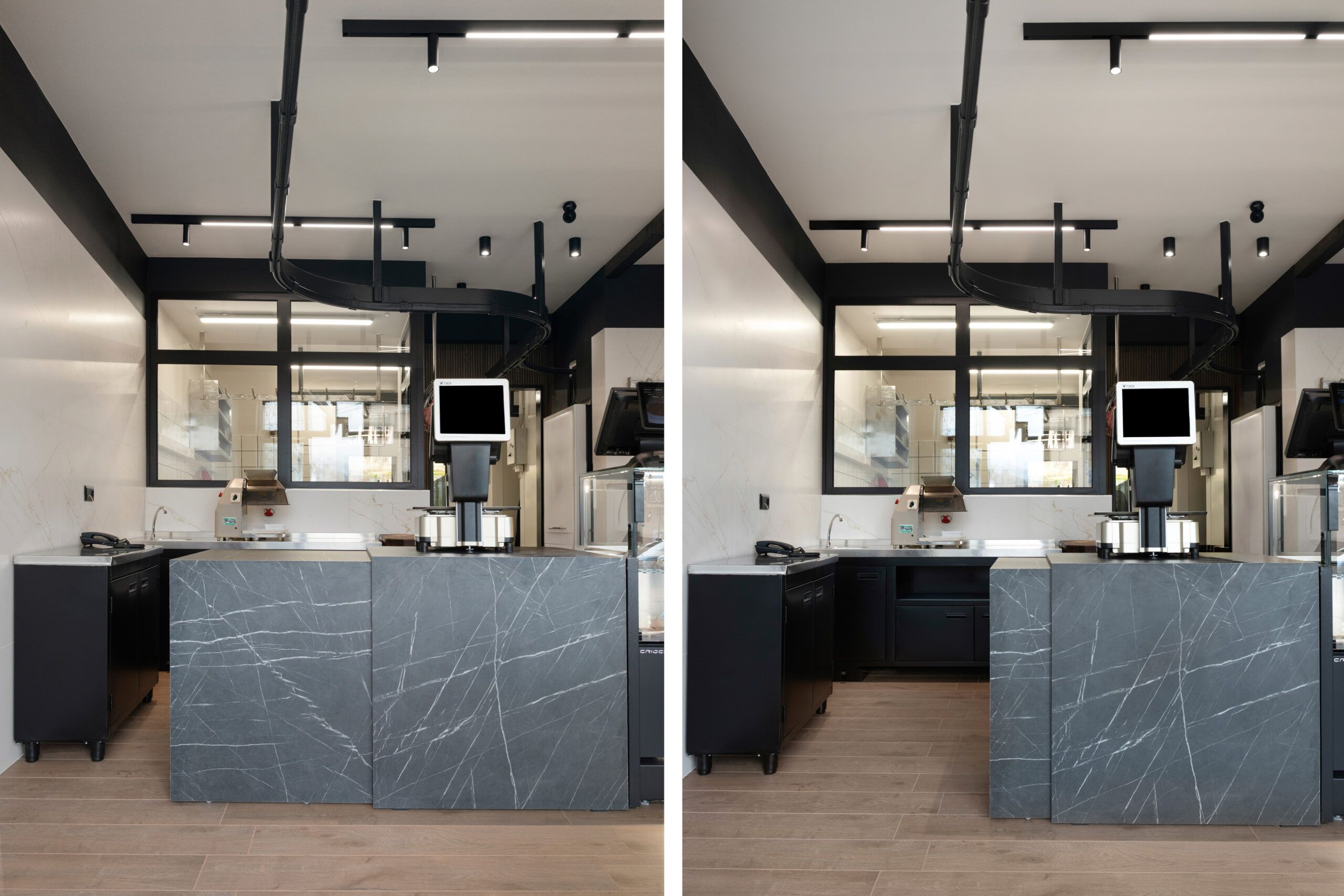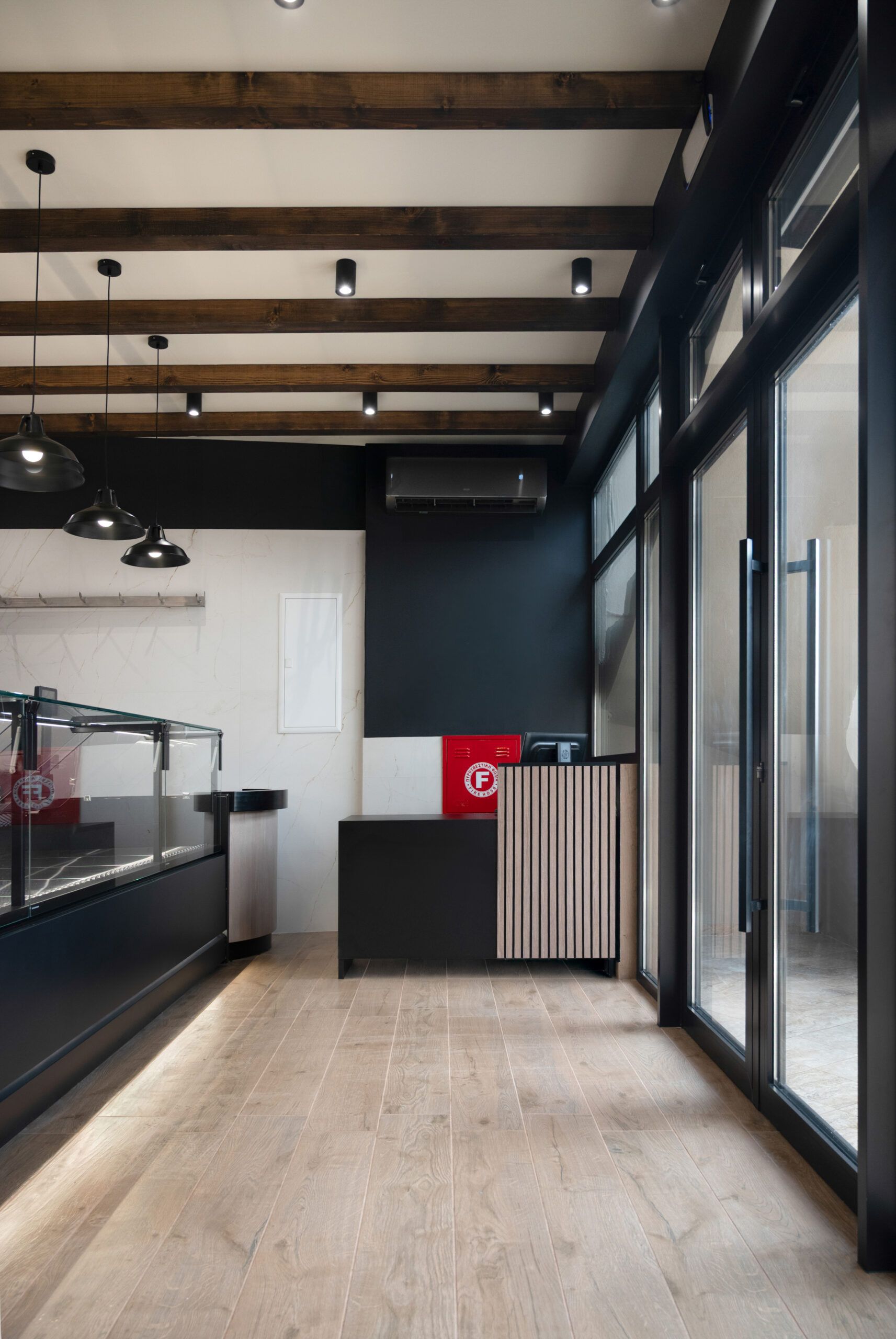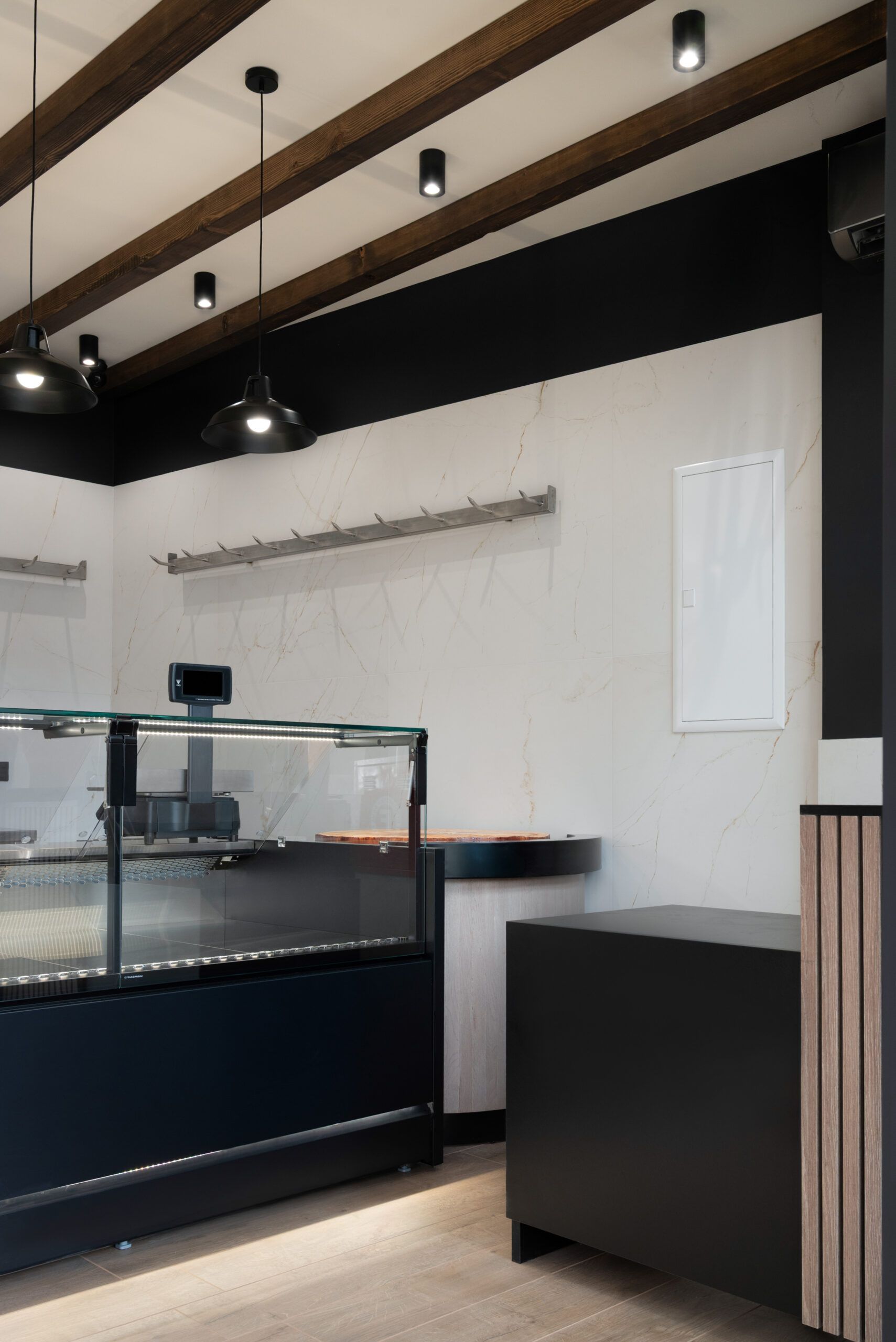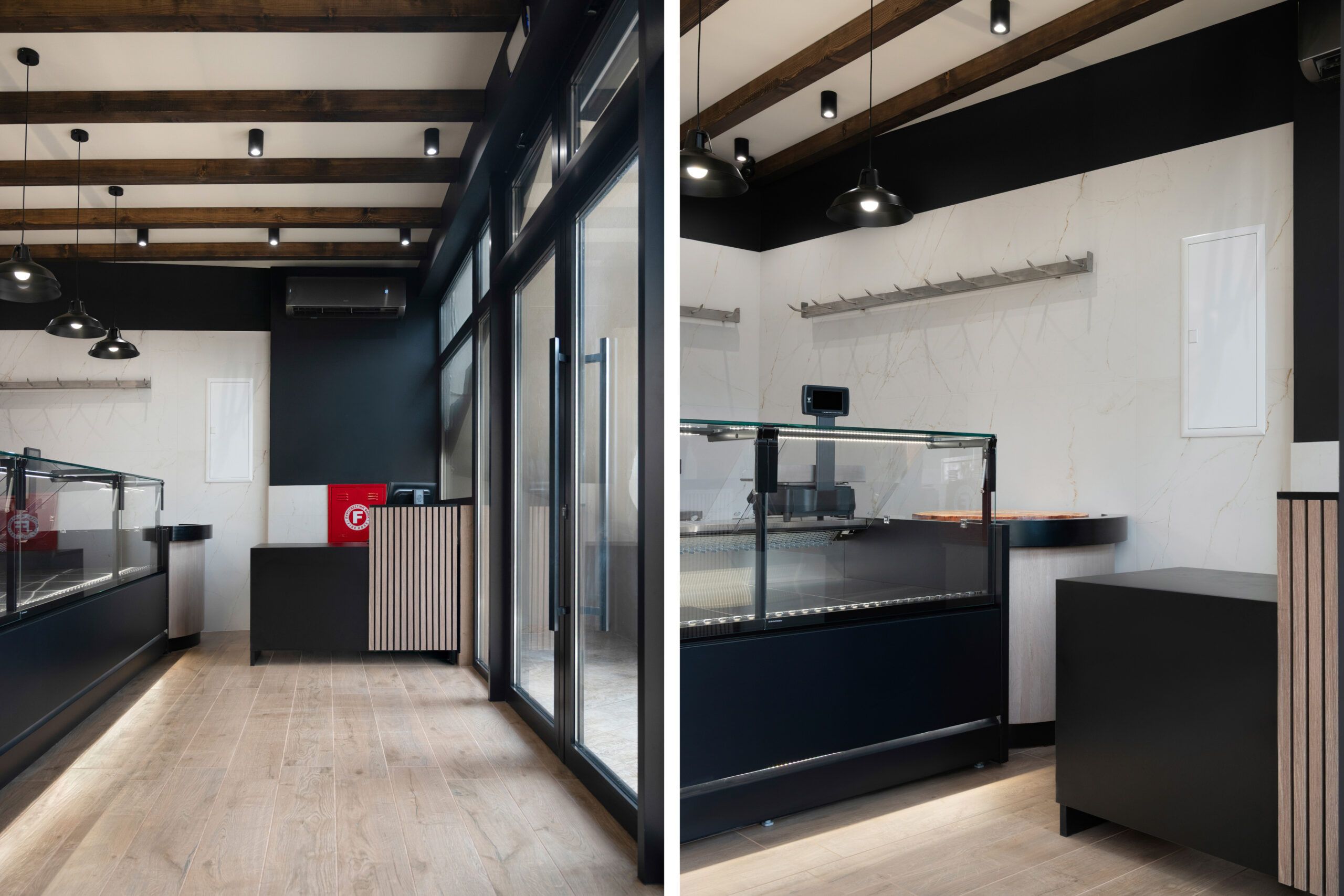 Το εργαστήριο διατηρεί οπτική επαφή με τον χώρο πώλησης, ενισχύοντας τη διαφάνεια και την αίσθηση εμπιστοσύνης. Η παλέτα κινείται σε μαύρους τόνους και φυσικό ξύλο, με εμφανείς δοκούς οροφής που προσδίδουν ρυθμό και χαρακτήρα. Τα σκούρα μεταλλικά στοιχεία, οι γυάλινες βιτρίνες και οι επιφάνειες τύπου μαρμάρου συνδυάζονται με φυσικό ξύλο στην οροφή, δημιουργώντας μια σύγχρονη industrial ταυτότητα με ζεστό χαρακτήρα.