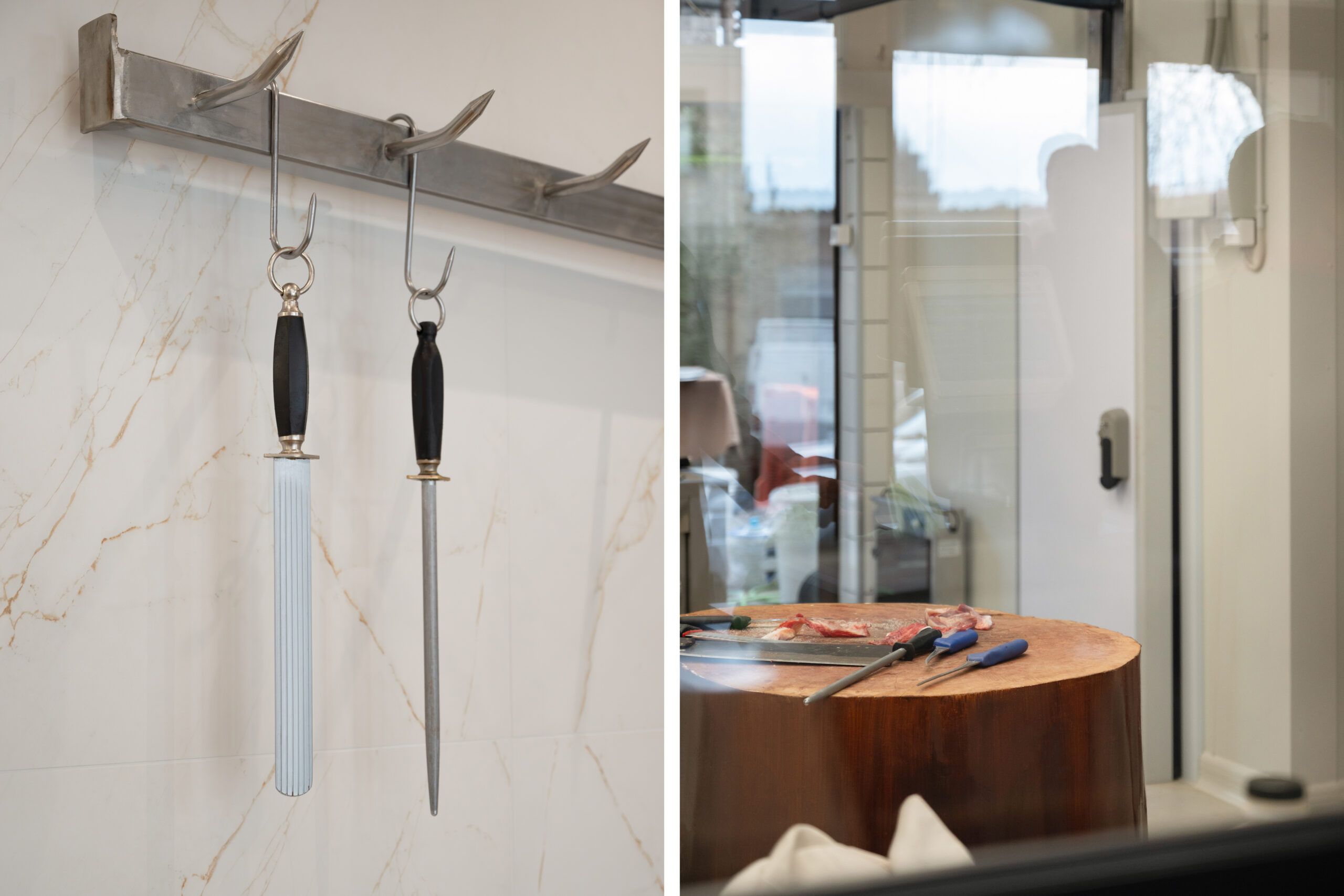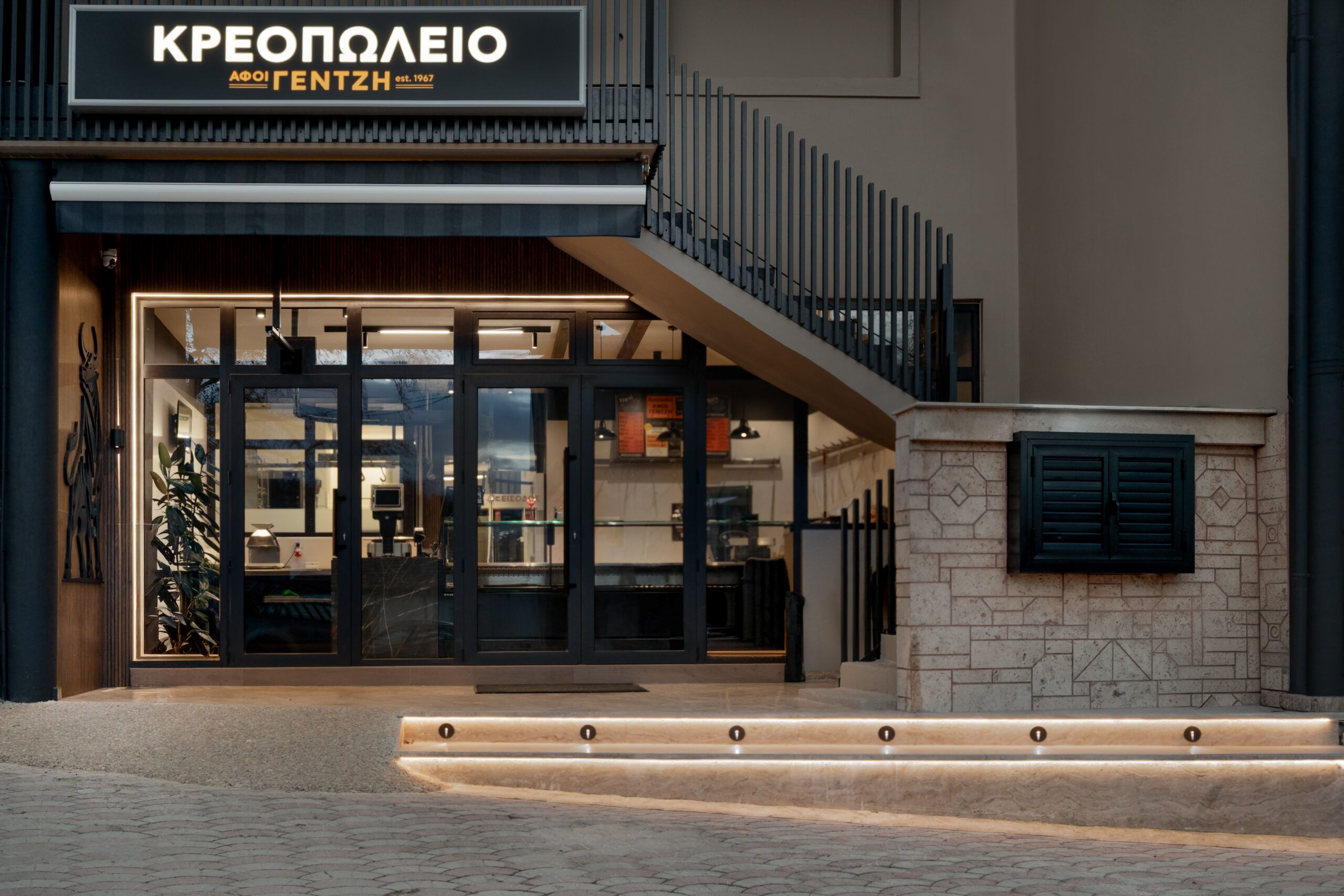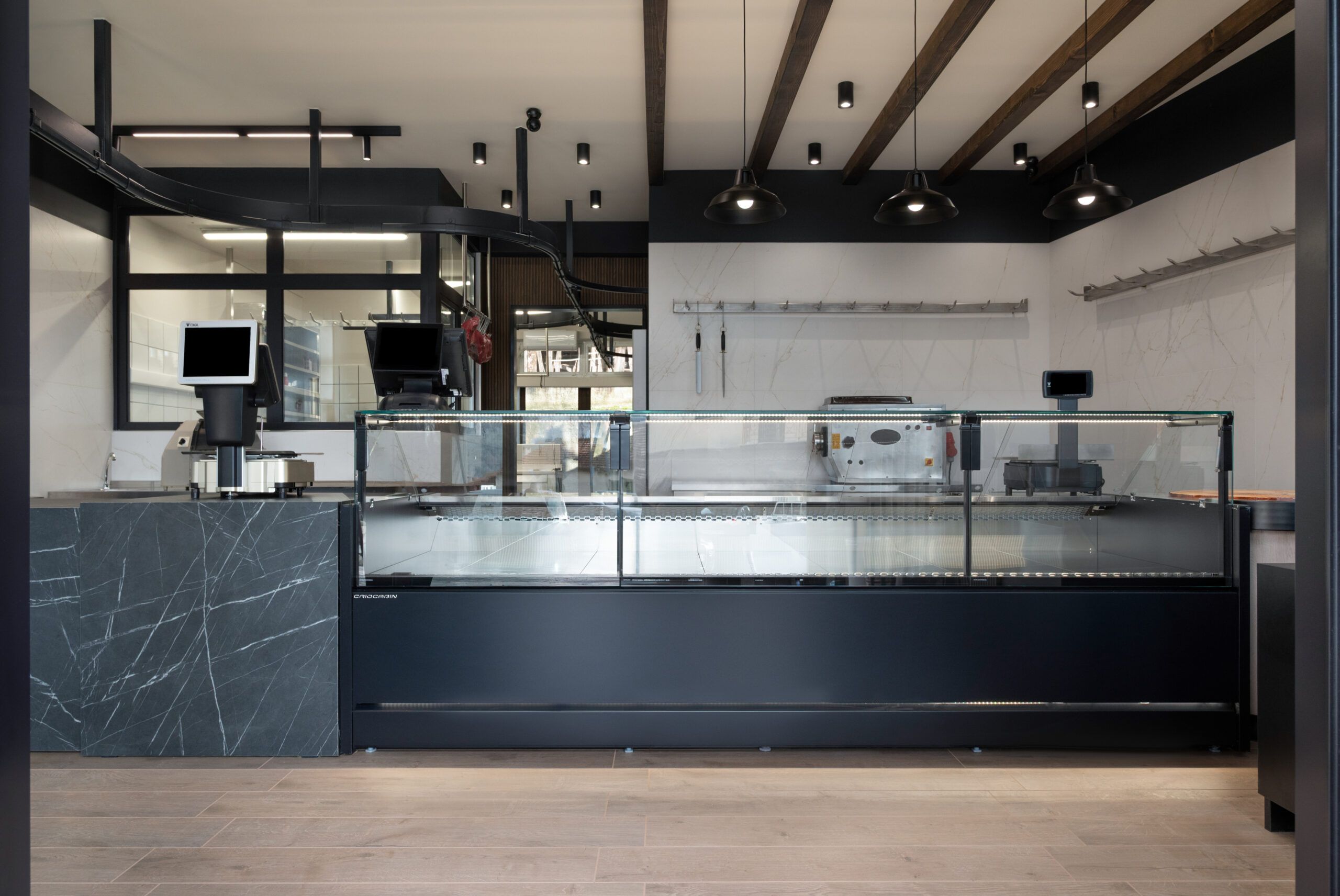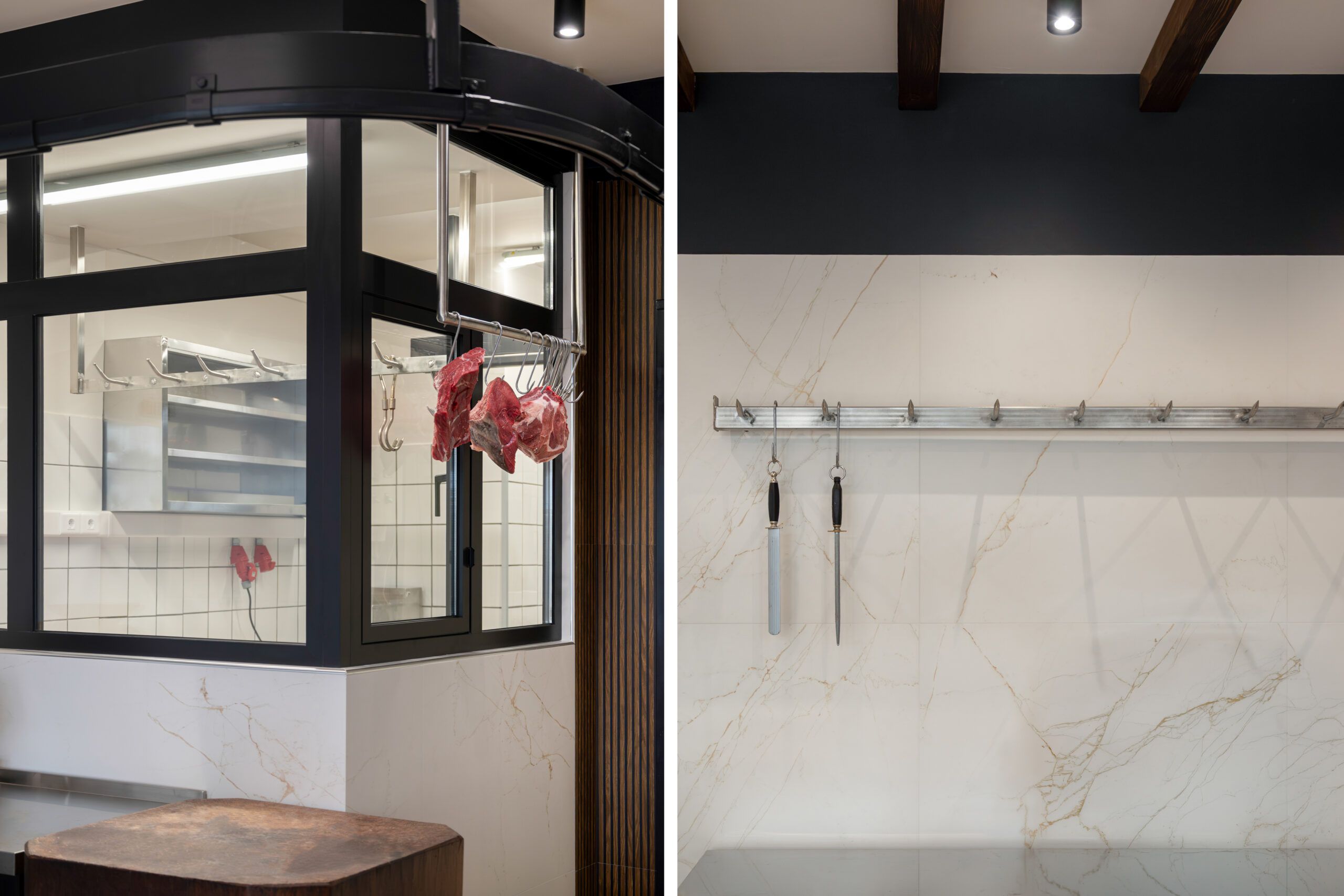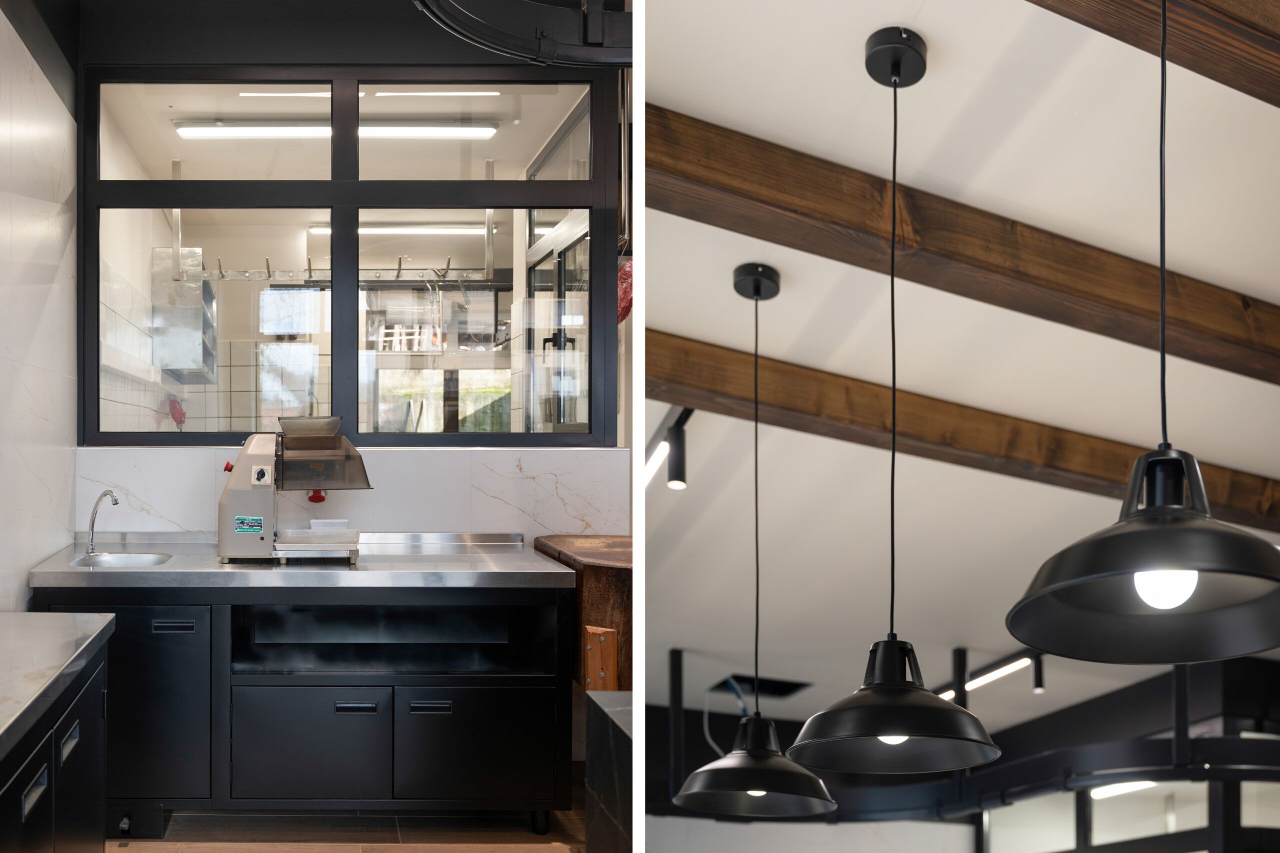 Στη συγκεκριμένη ανακαίνιση, ο χώρος οργανώθηκε με ξεκάθαρη ροή εργασιών και έμφαση στην υγιεινή και την εργονομία. Δημιουργήθηκε γραμμή μεταφοράς κρεάτων στο εργαστήριο για άμεση και ασφαλή διακίνηση προϊόντων, ενώ τα ψυγεία και οι χώροι προετοιμασίας εντάχθηκαν στον σχεδιασμό με τρόπο διακριτικό αλλά πλήρως λειτουργικό.